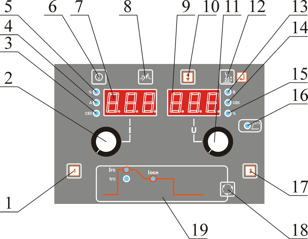 При этом пульт обеспечивает: • регулировку сварочного тока выпрямителя; • регулировку тока и времени в начале сварки ("Горячий старт"); • регулировку тока короткого замыкания выпрямителя ("Динамика" или "Форсаж"); • регулировку длины дуги (ограничение тепловложения); • работу в режиме блока снижения напряжения (БСН); • работу в режиме антиприлипания электрода. |